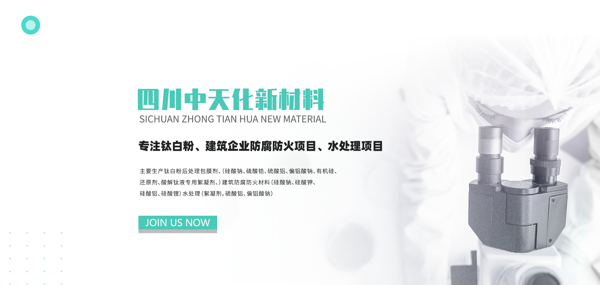 經營范圍:主要生產鈦白粉后處理包膜劑、(硅酸鈉、硫酸鋯、硫酸鋁、偏鋁酸鈉、有機硅、還原劑、酸解鈦液專用絮凝劑、)建筑防腐防火材料(硅酸鈉、硅酸鉀、硅酸鋁、硅酸鋰)水處理(絮凝劑,硫酸鋁、偏鋁酸鈉)